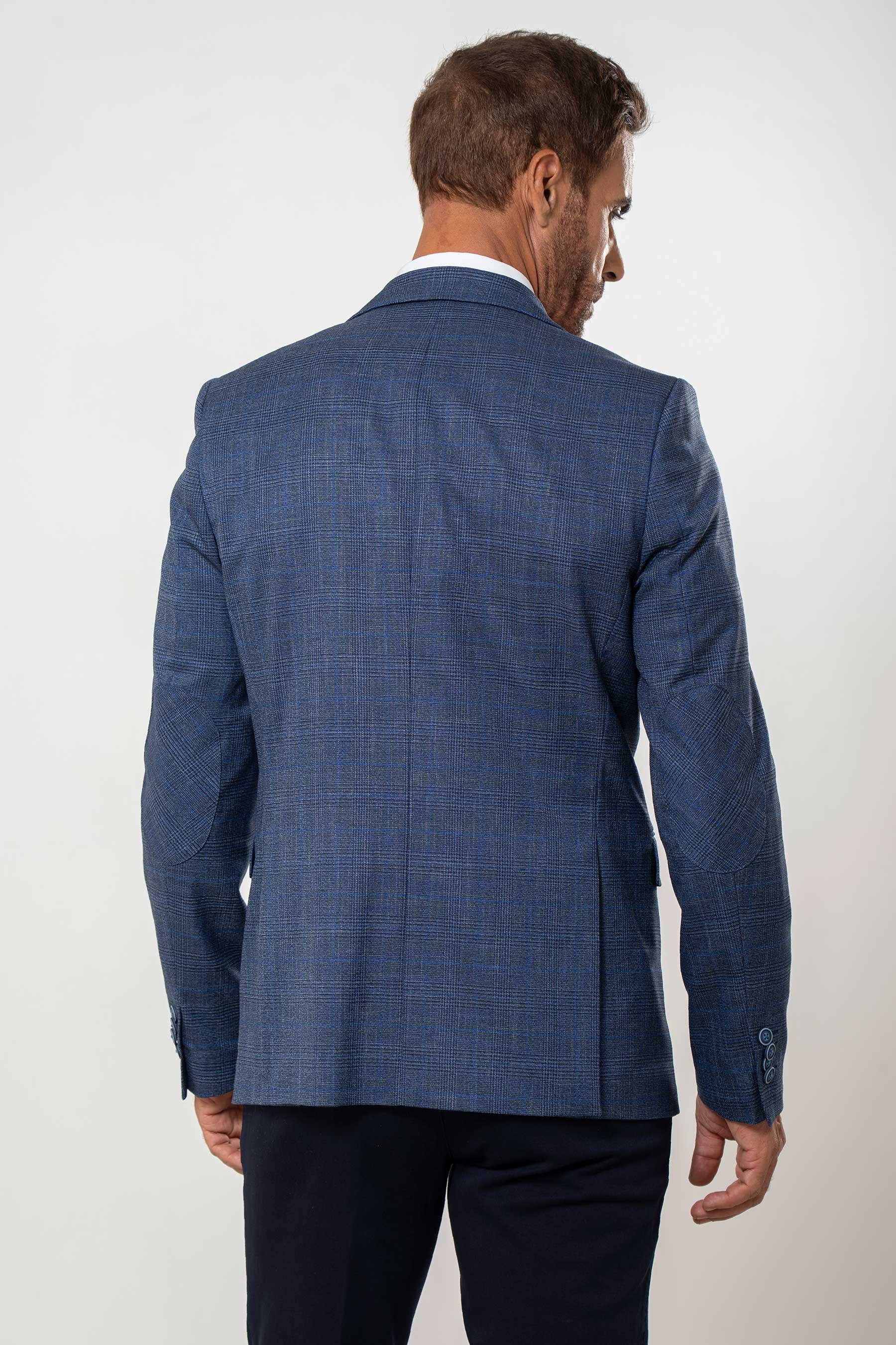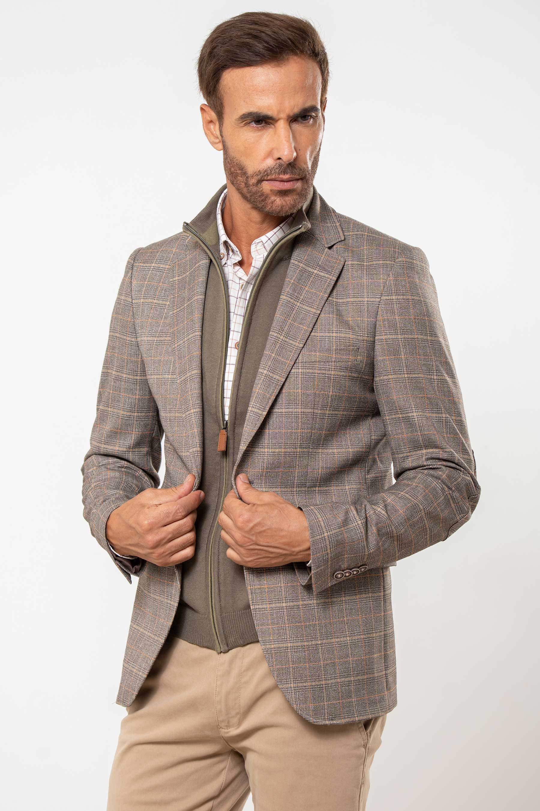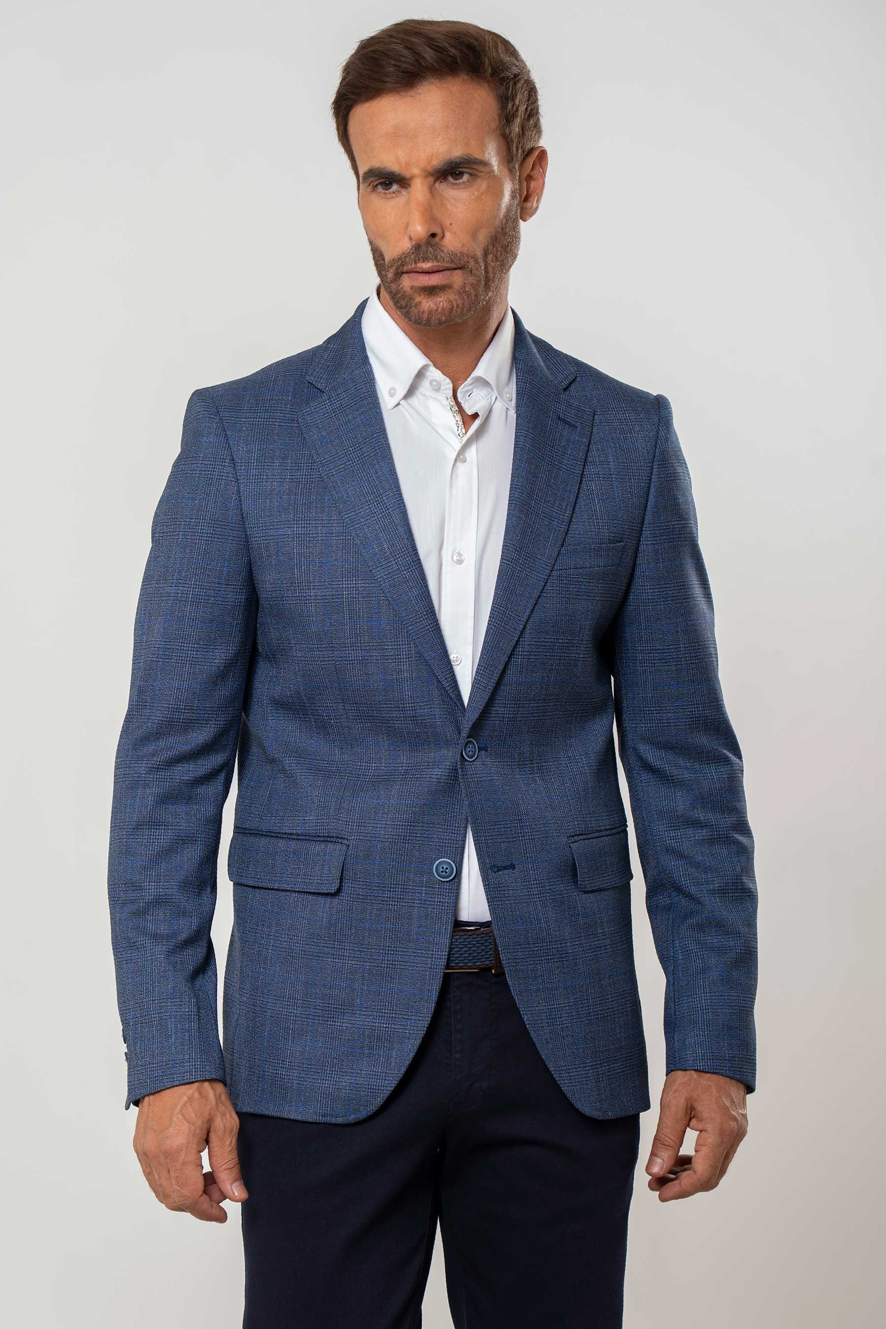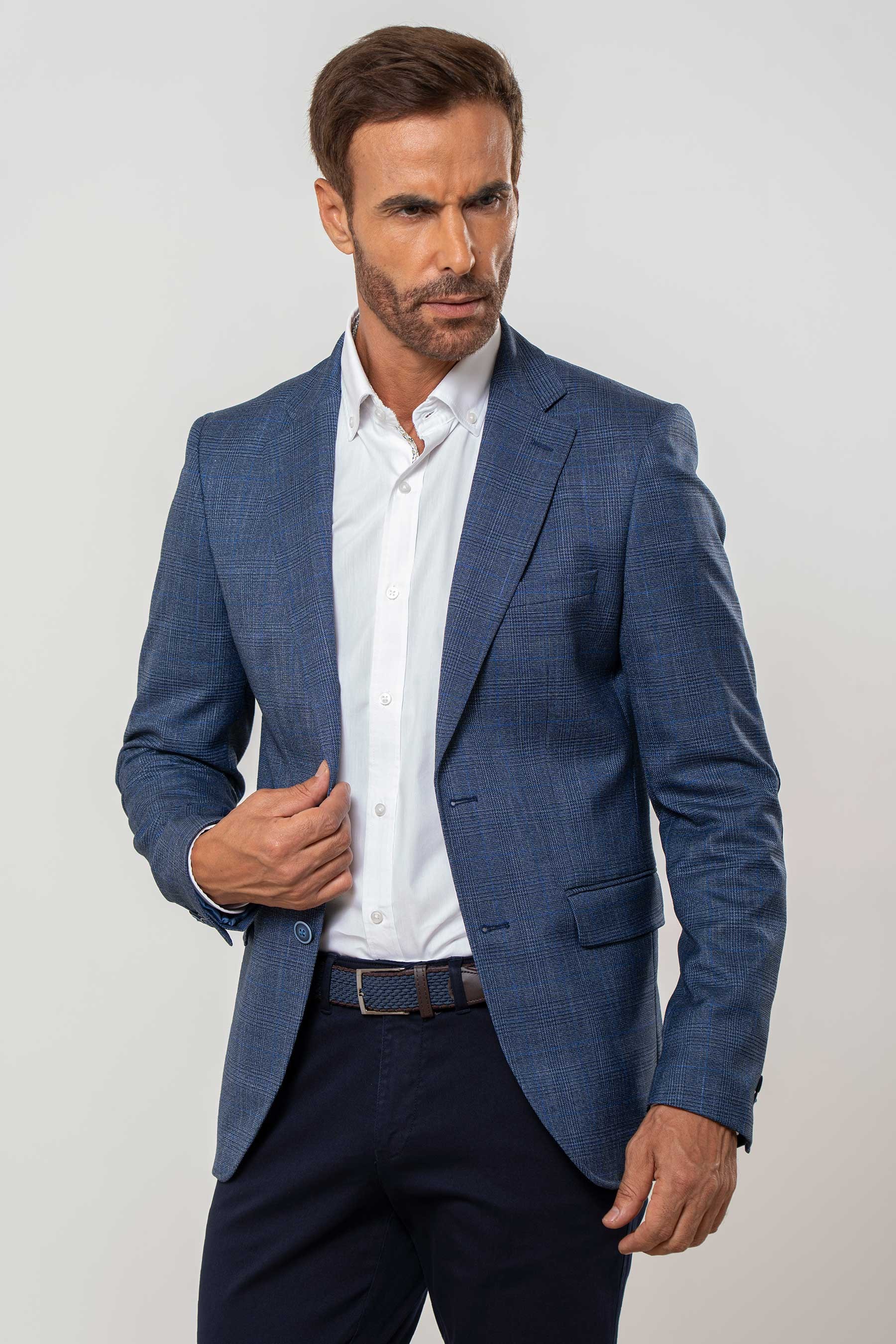 Americana elástica cuadrícula, patrón Slim Fit, carteras rectas y dos aberturas traseras. Coderas en tejido principal. Cierre con dos botones. Solapa y carteras cosidas a cinco milímetros del canto. Interior con forro liso al tono combinado con vivos y tres bolsillos. Botones de repuesto incluidos.