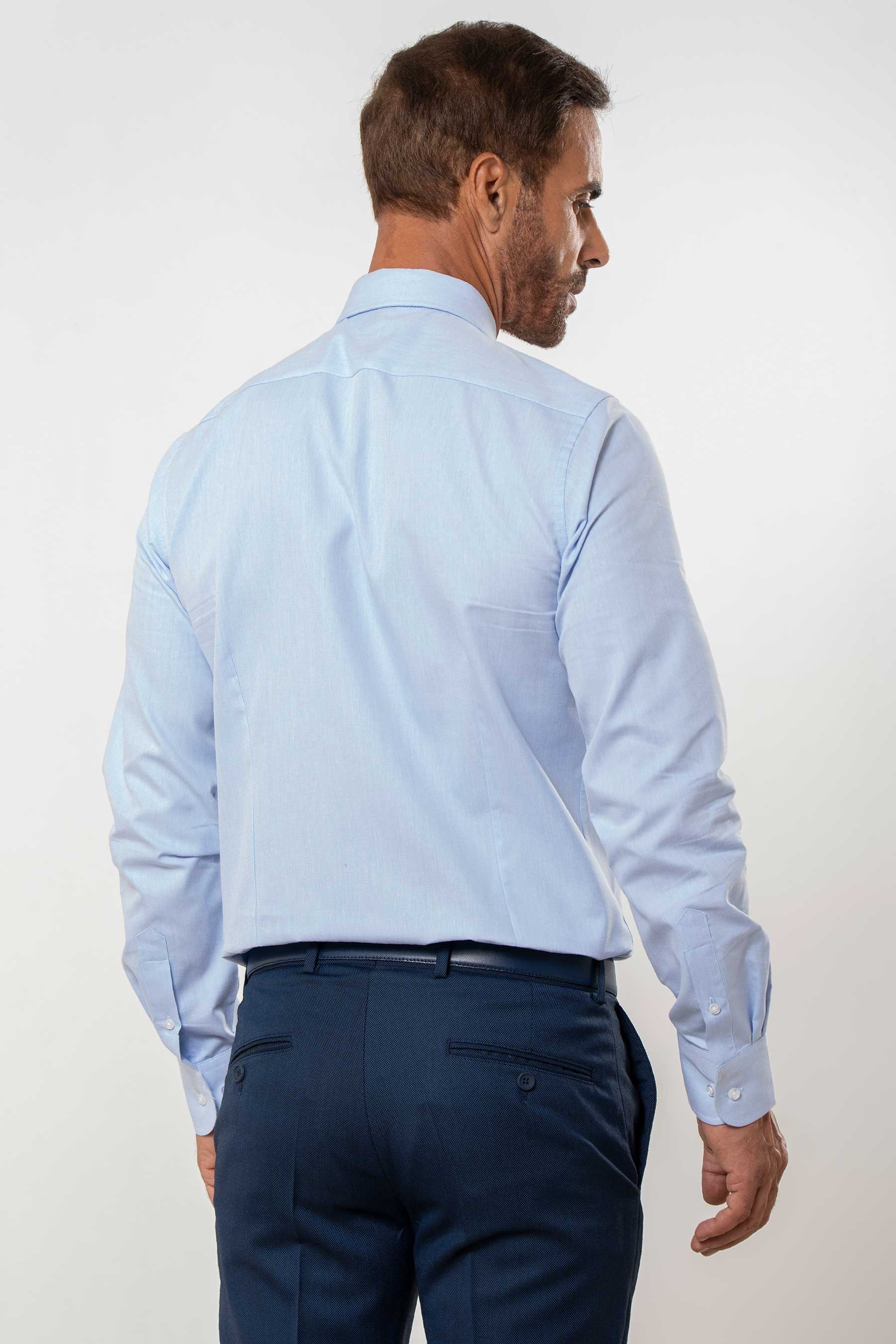 Camisa de vestir entallada microcuadrillé, con dos pinzas traseras de entalle, sin bolsillo, puños con un ojal y dos botones, tapeta delantera en abotonadura, cuello sin botón y vivo de color azul marino en el interior. Botones de repuesto incluidos.