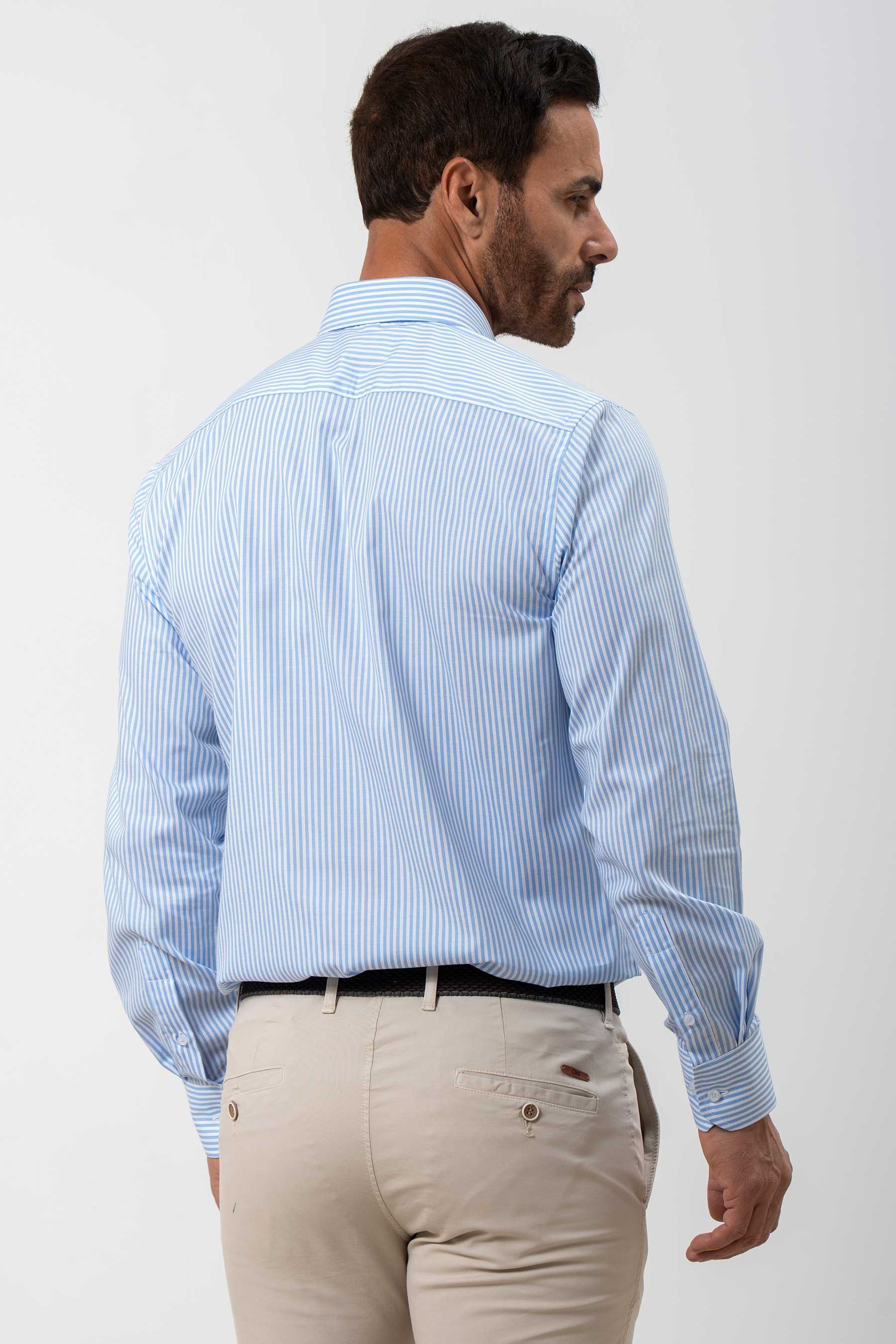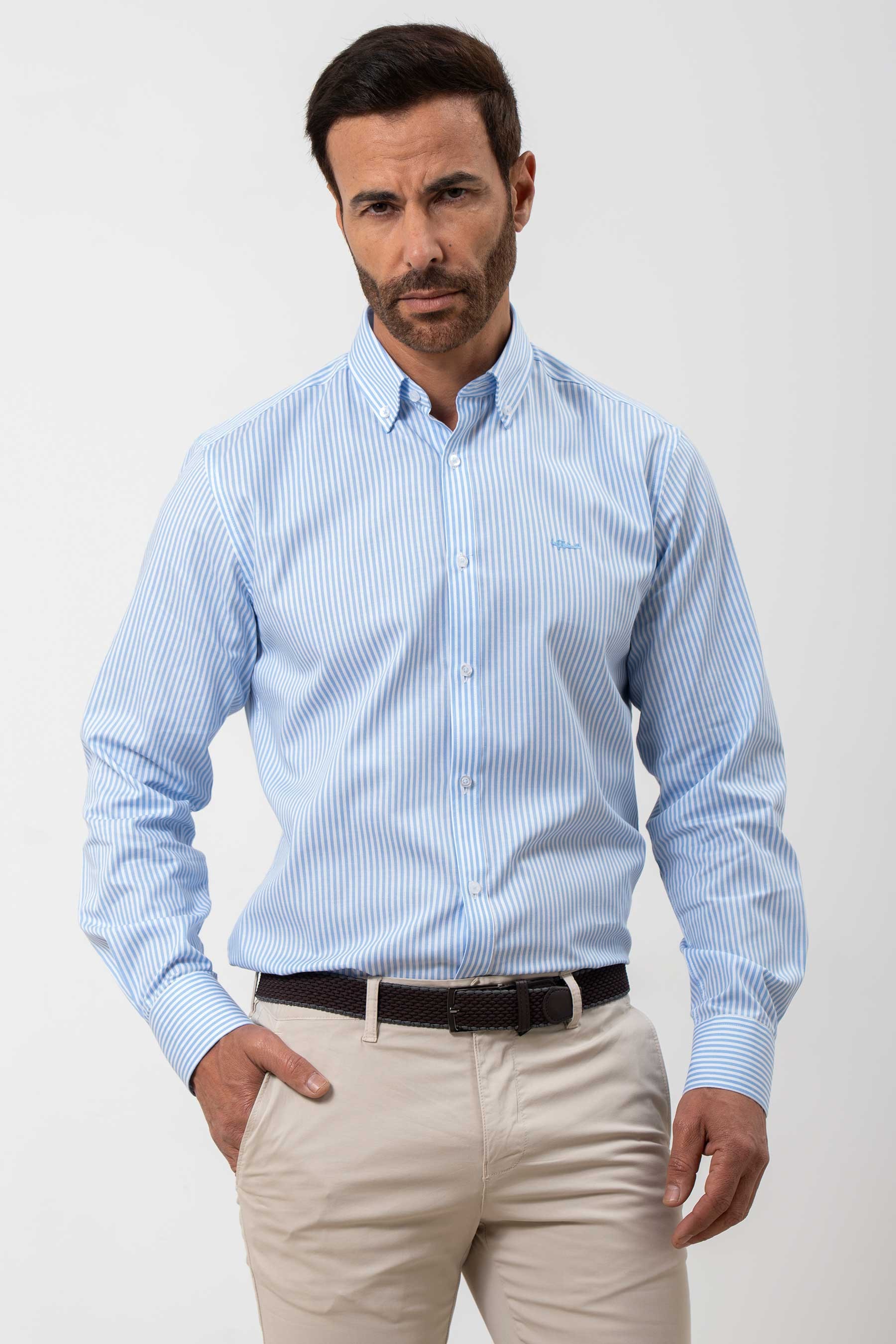 Camisa sport semientallada listas verticales, bordado delantero, puños con un ojal y dos botones, tapeta delantera en abotonadura, cuello con botón y contraste en el interior del mismo. Botones de repuesto incluidos.
