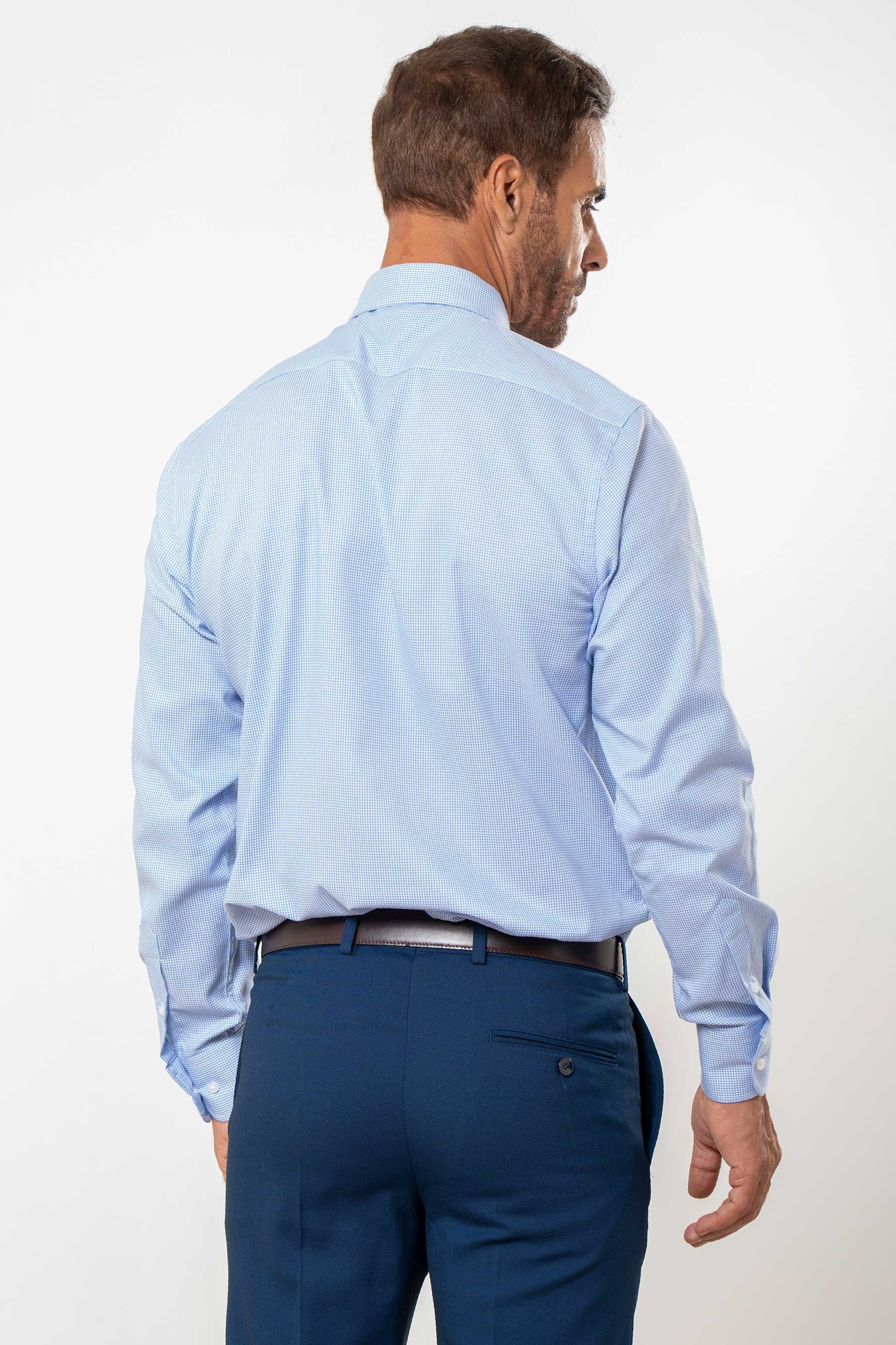 Camisa de vestir semientallada estructura pata de gallo, puños con un ojal y dos botones, cuello sin botón y contraste azul marino en el interior del mismo. Botones de repuesto incluidos.