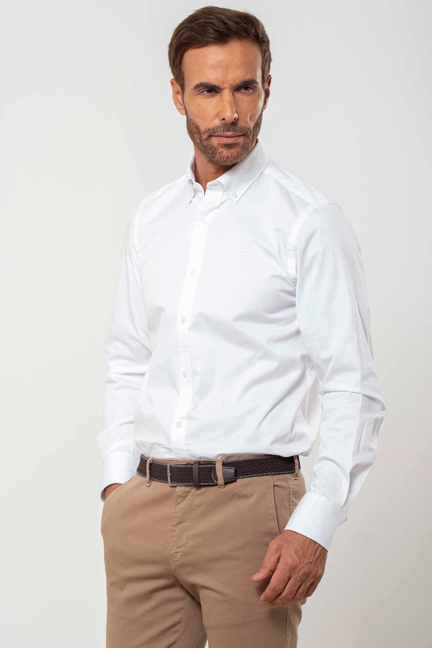 Camisa semientallada lisa, confeccionada en tejido 100% algodón. Bordado delantero, puños con un ojal y dos botones, cuello con botón. Botones de repuesto incluidos.