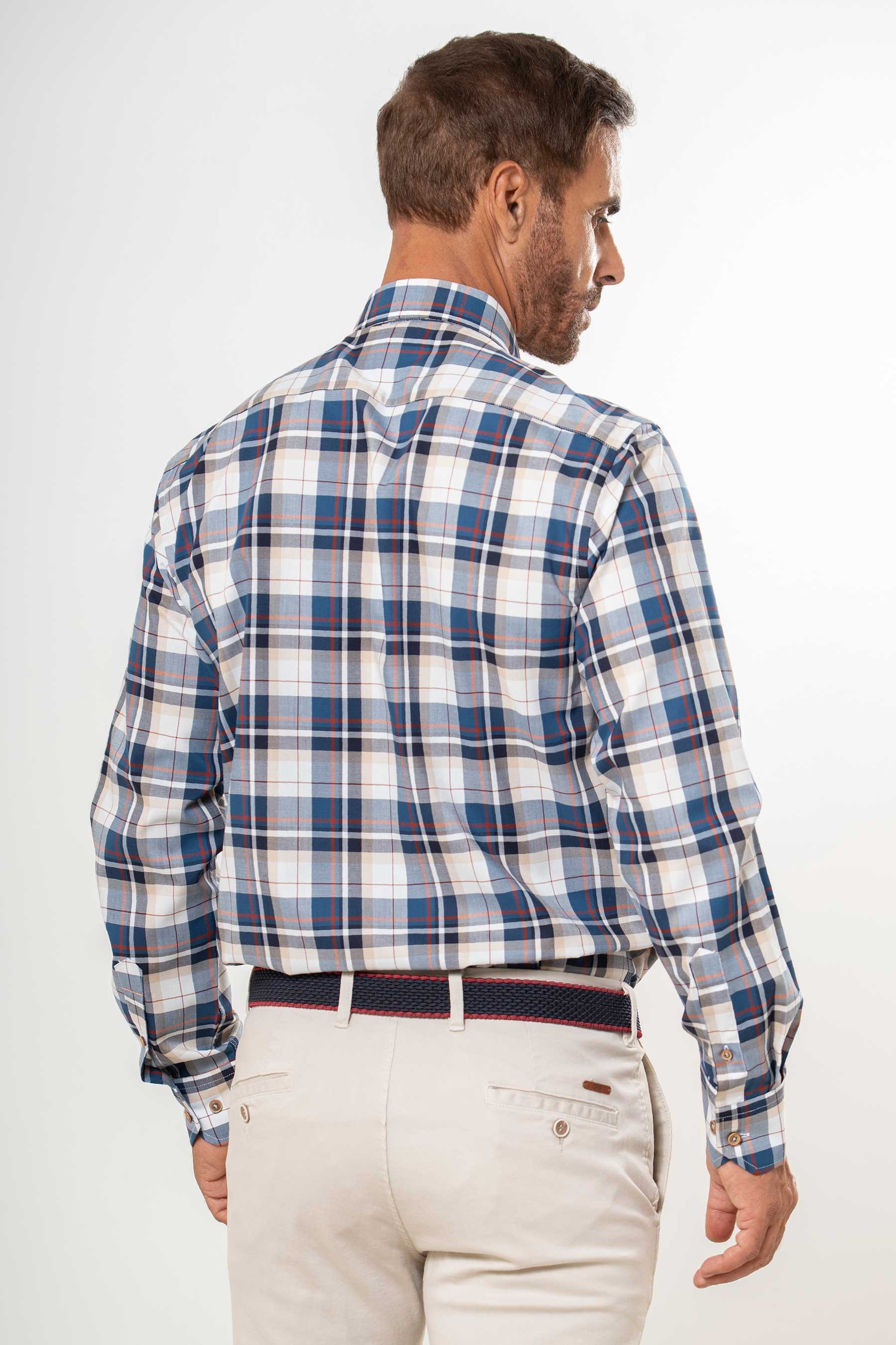 Camisa semientallada viella fina cuadrícula azul. Cuello con botón, bolsillo delantero, puños con un ojal y dos botones. Botones de repuesto incluidos.