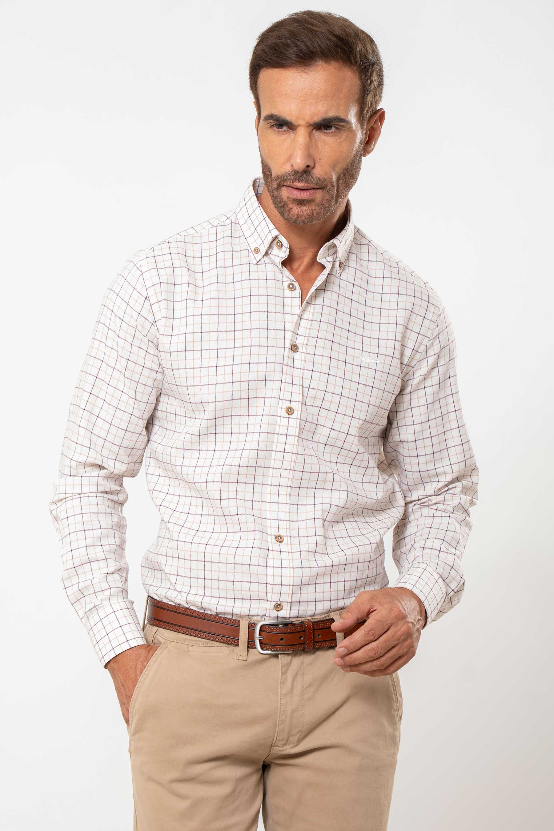 Camisa semientallada viella fina cuadro mediano beige. Cuello con botón, bordado delantero, puños con un ojal y dos botones. Botones de repuesto incluidos.