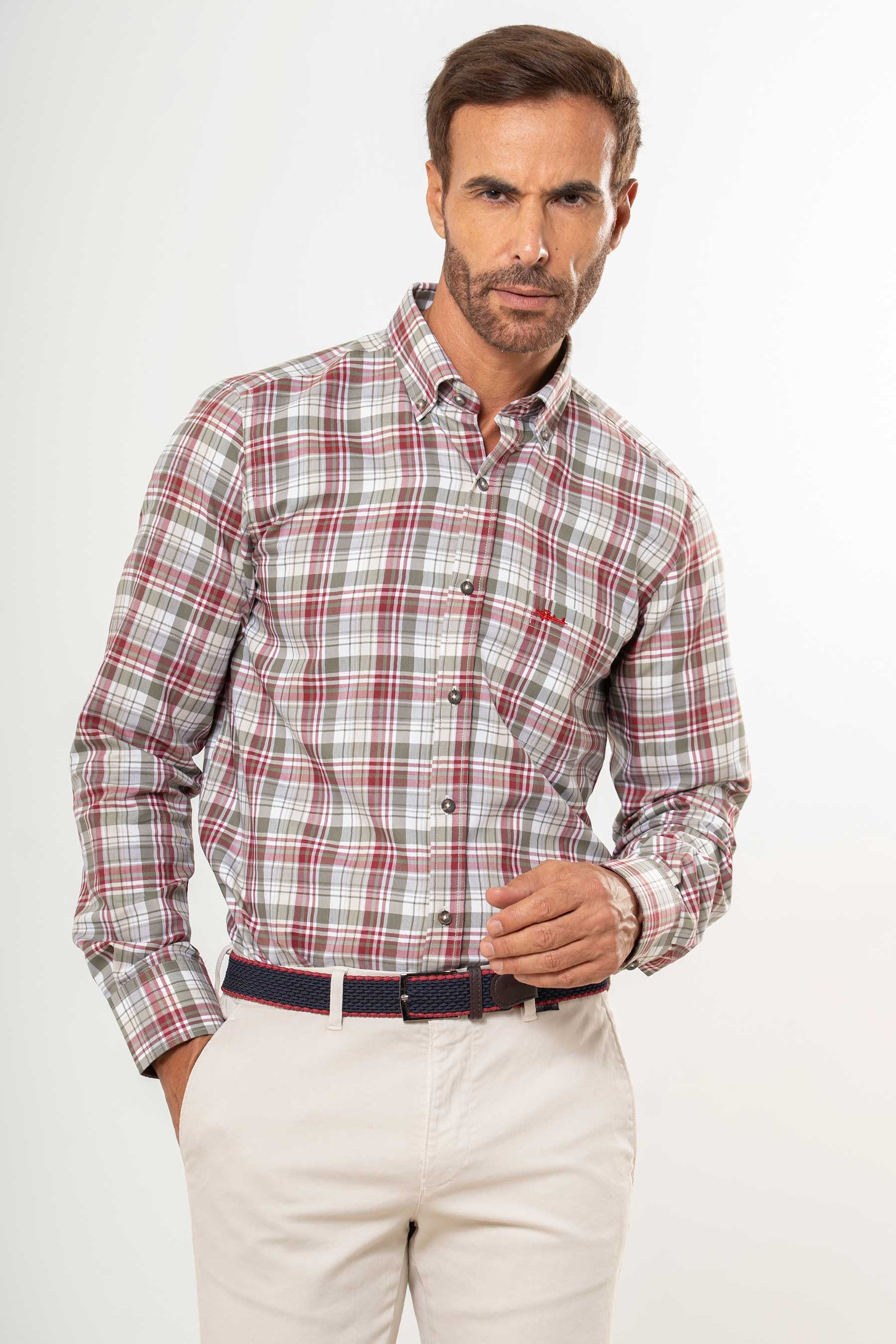 Camisa semientallada viella fina cuadrícula grande bicolor. Cuello con botón, bolsillo con bordado delantero, puños con un ojal y dos botones. Botones de repuesto incluidos.