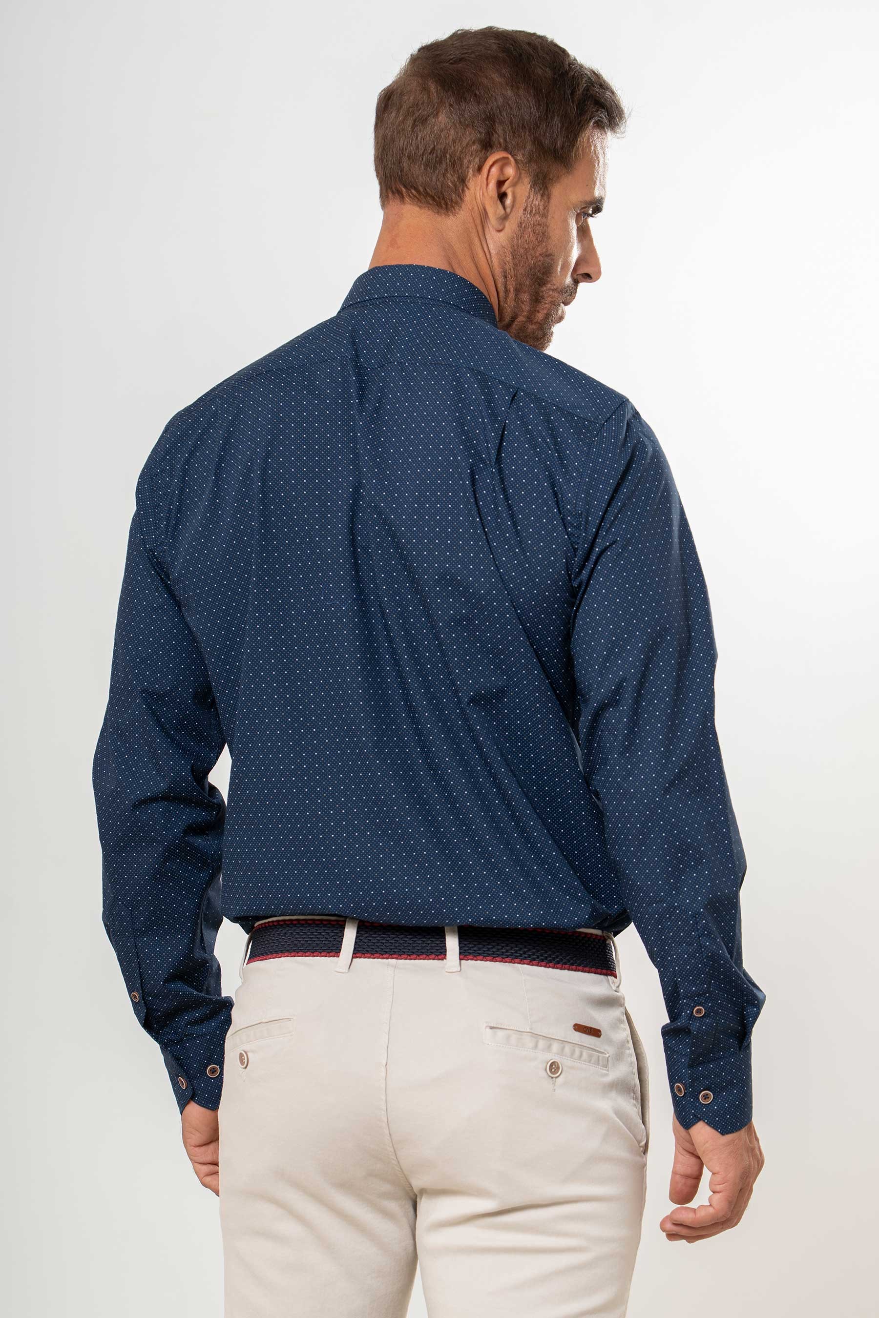 Camisa semientallada estampado topos azul marino, sin bolsillo, puños con un ojal y dos botones, tapeta delantera en abotonadura y cuello con botón. Botones de repuesto incluidos.