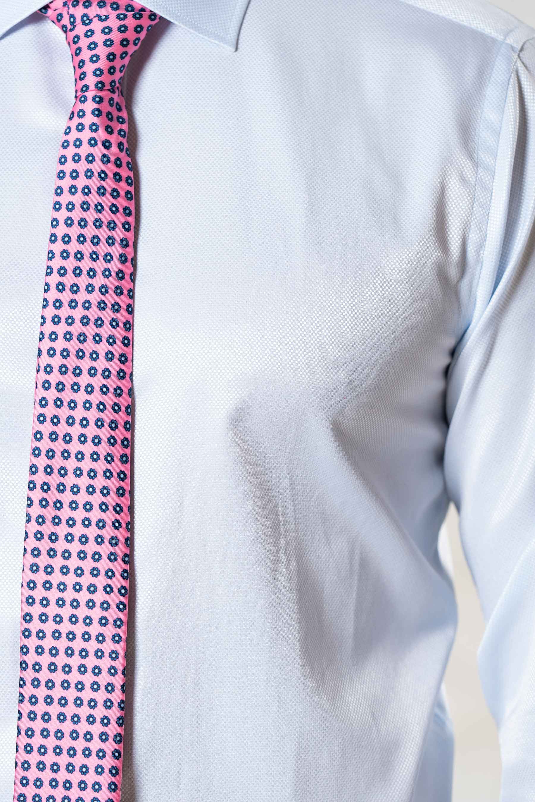 Camisa de vestir entallada de microestructura con dos pinzas traseras de entalle, sin bolsillo, puños con un ojal y dos botones, tapeta delantera en abotonadura, cuello sin botón y vivo de color azul marino en el interior del mismo. Botones de repuesto incluídos.