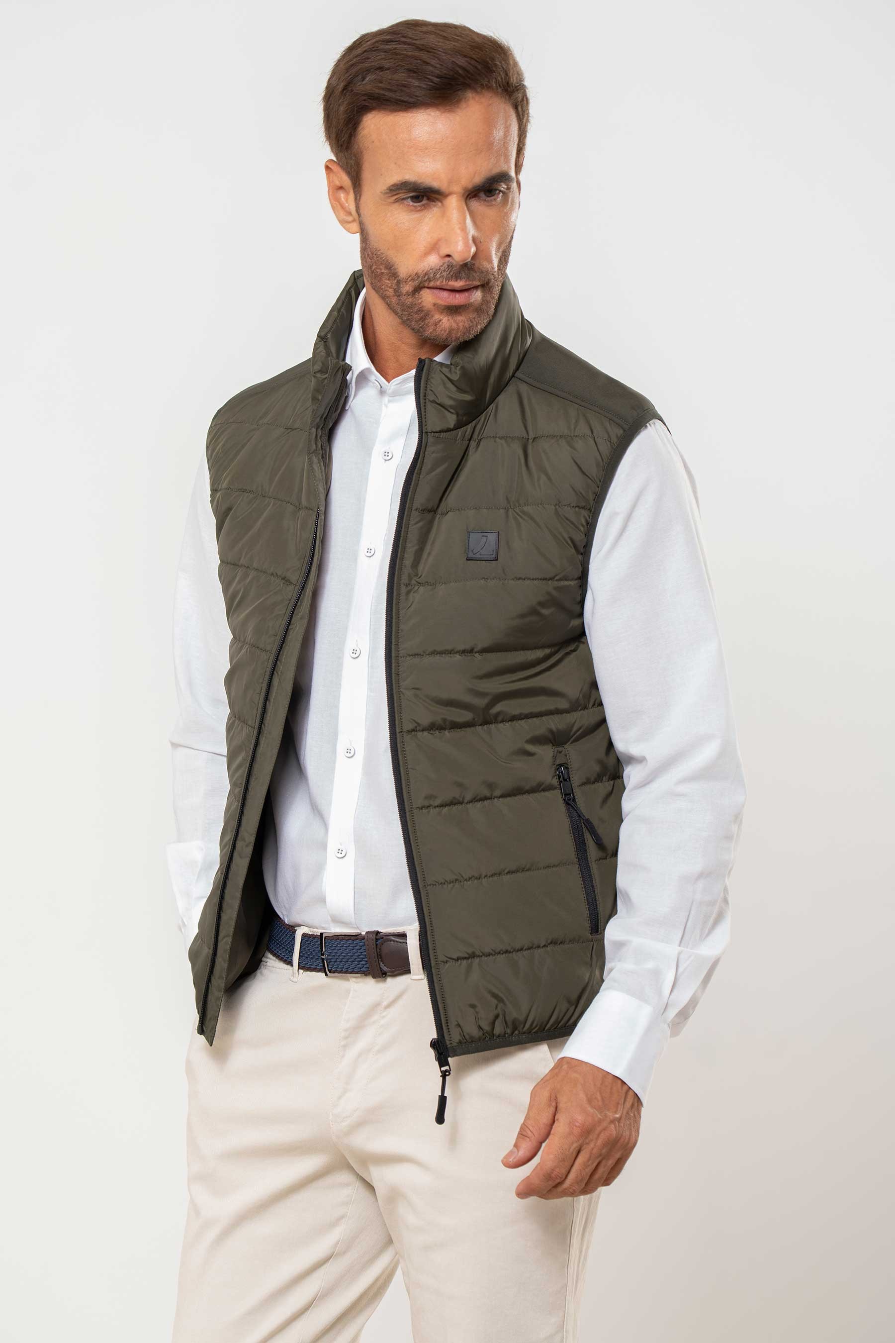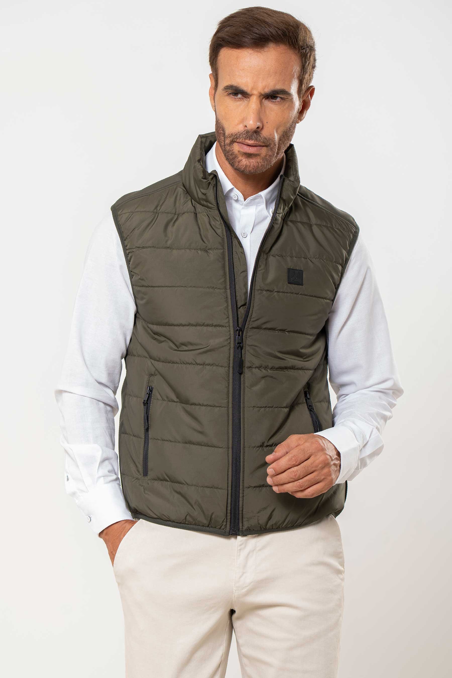 Chaleco acolchado con espalda combinada, dos bolsillos laterales y cierre central de cremallera. Interior con espalda afelpada y un bolsillo.