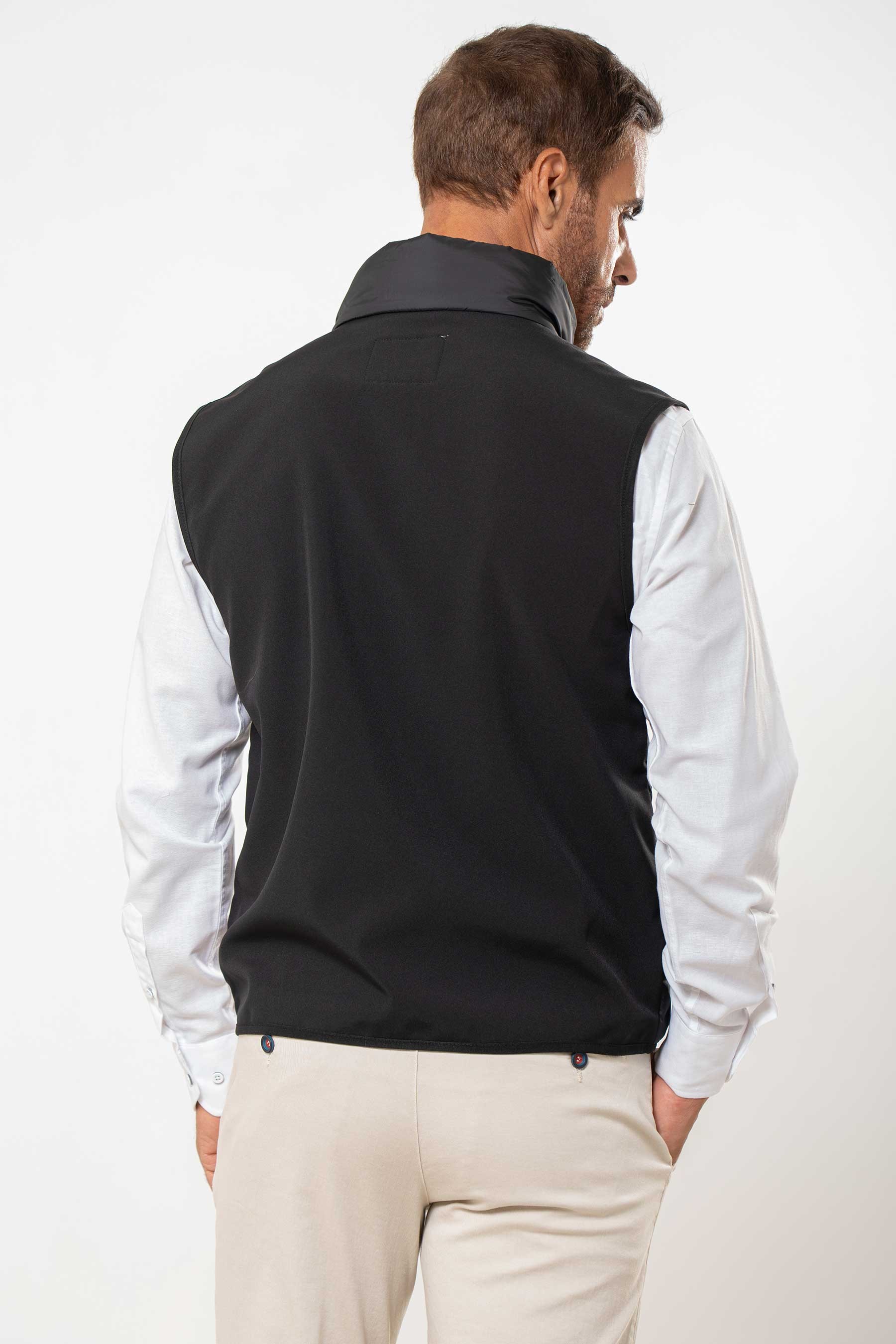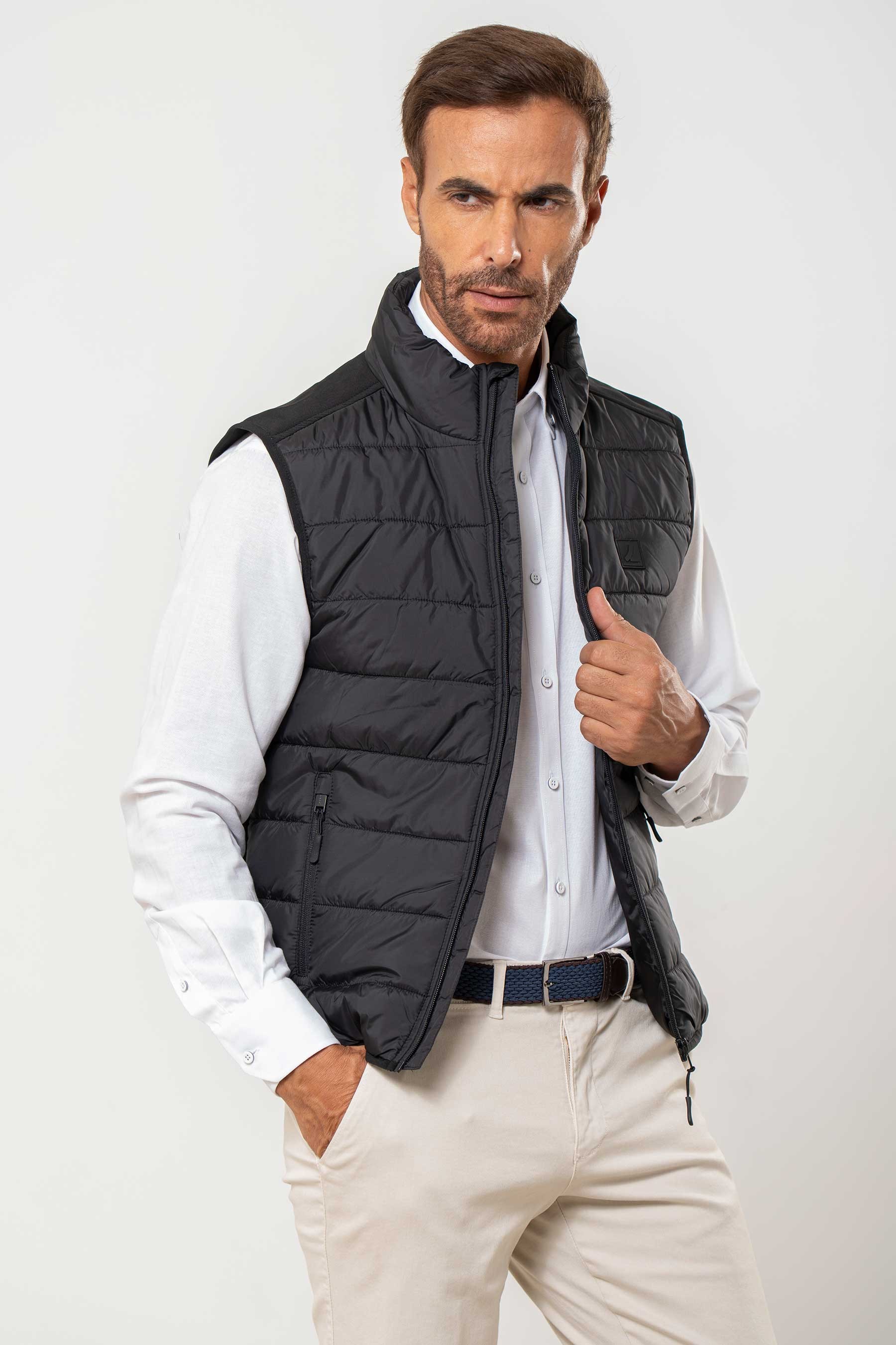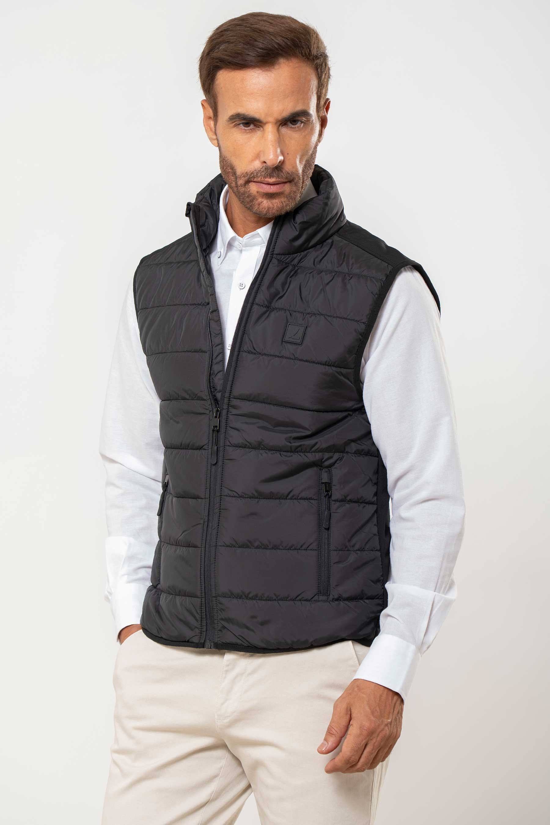 Chaleco acolchado con espalda combinada, dos bolsillos laterales y cierre central de cremallera. Interior con espalda afelpada y un bolsillo.