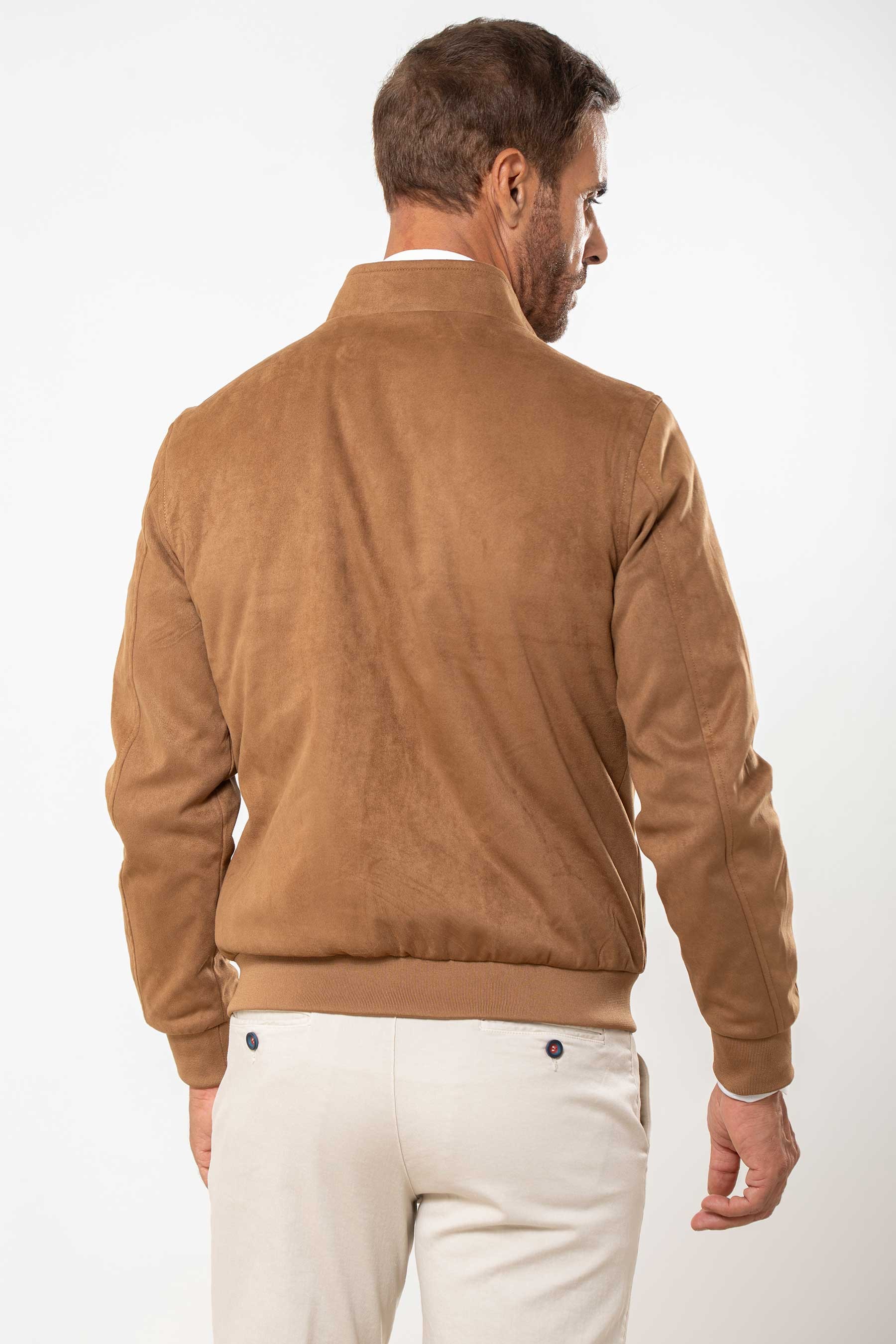 Cazadora de antelina semi acolchada, puños y cinturilla con ajuste elástico, dos bolsillos laterales con cierre de broche metálico. Cierre central con cremallera. Interior con un bolsillo y forro liso al tono.