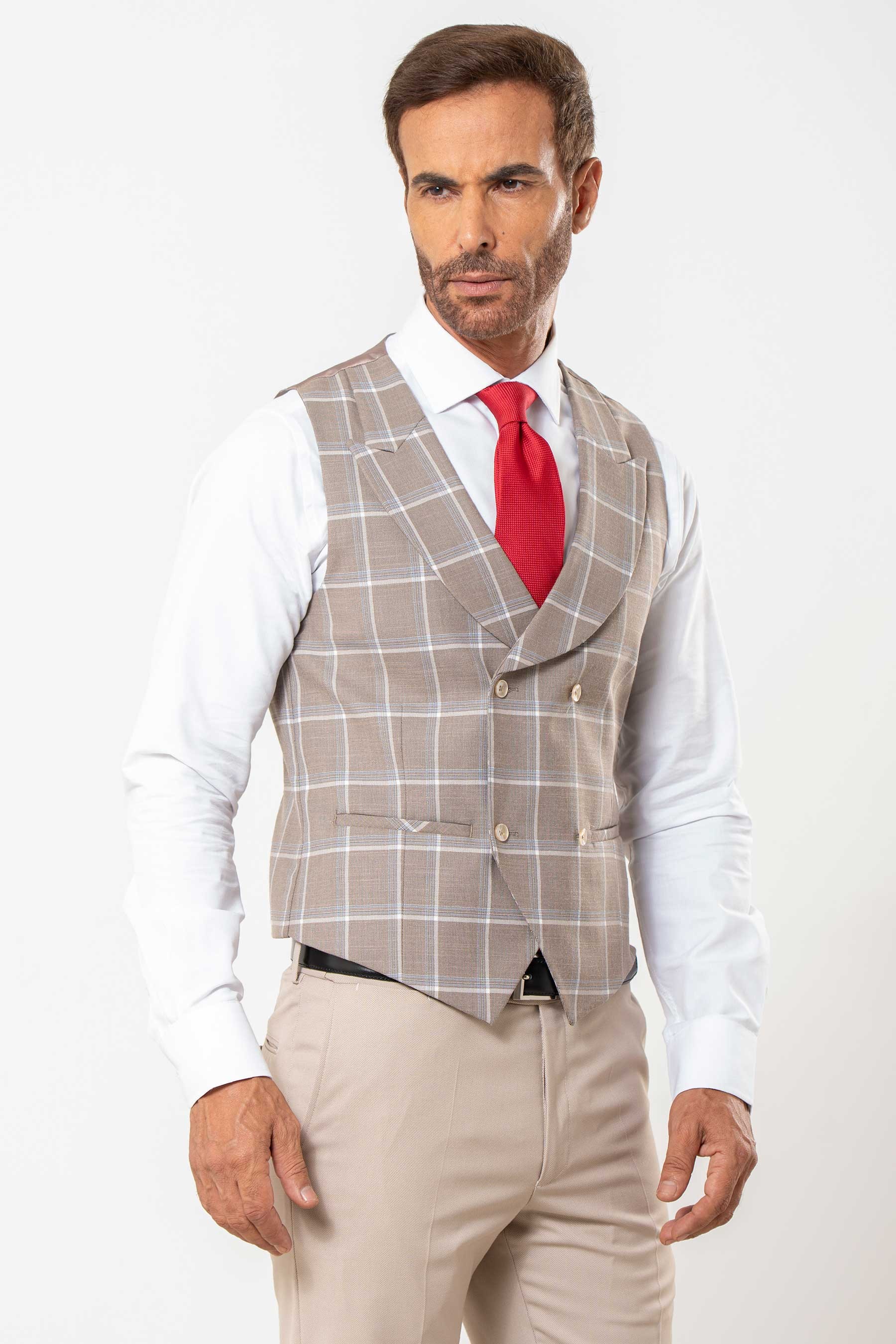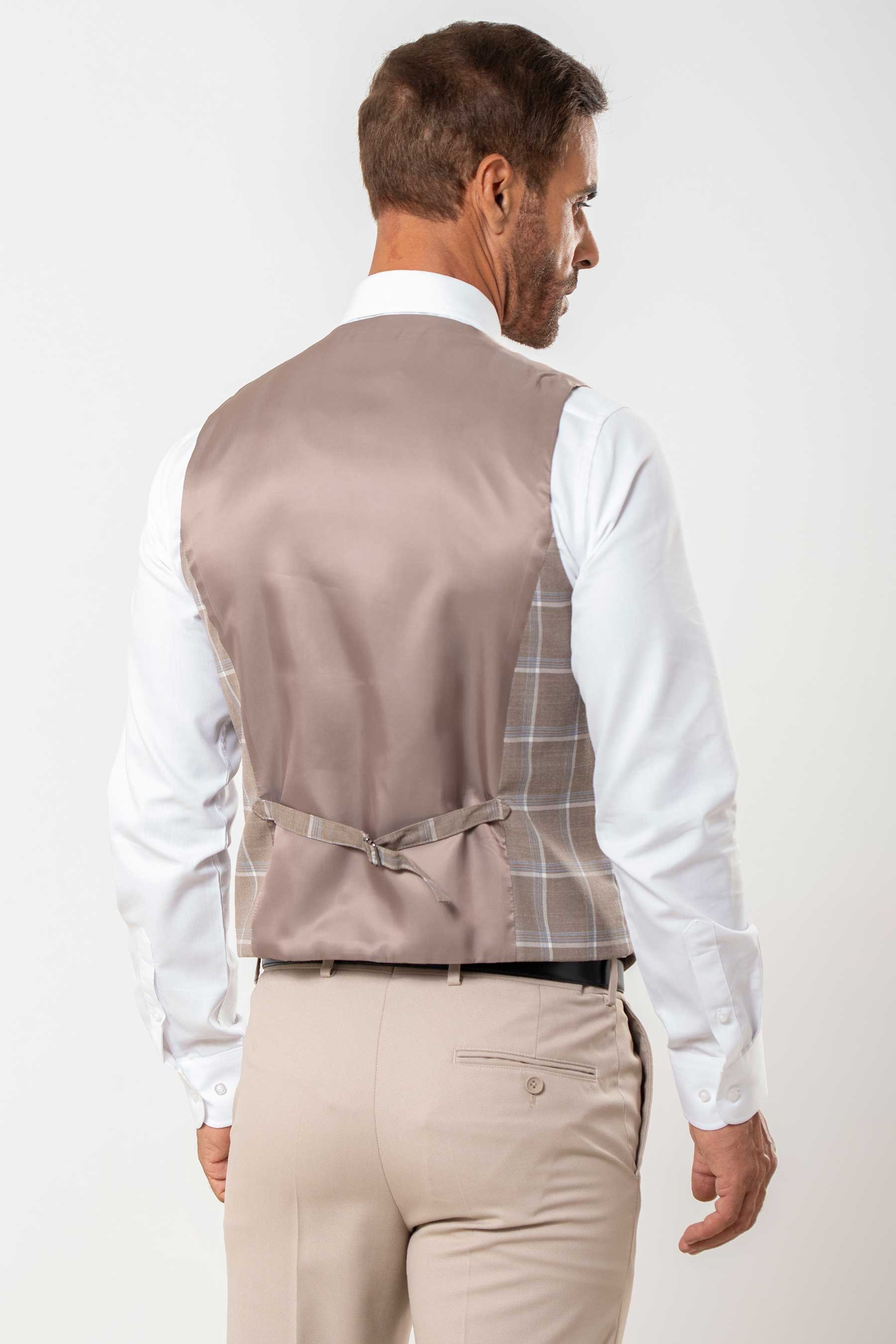 Chaleco cruzado con solapa cuadrícula beige, dos bolsillos delanteros, abotonadura cruzada de dos botones y uno interior. Trabilla trasera ajustable con aplique metálico. Espalda lisa al tono.