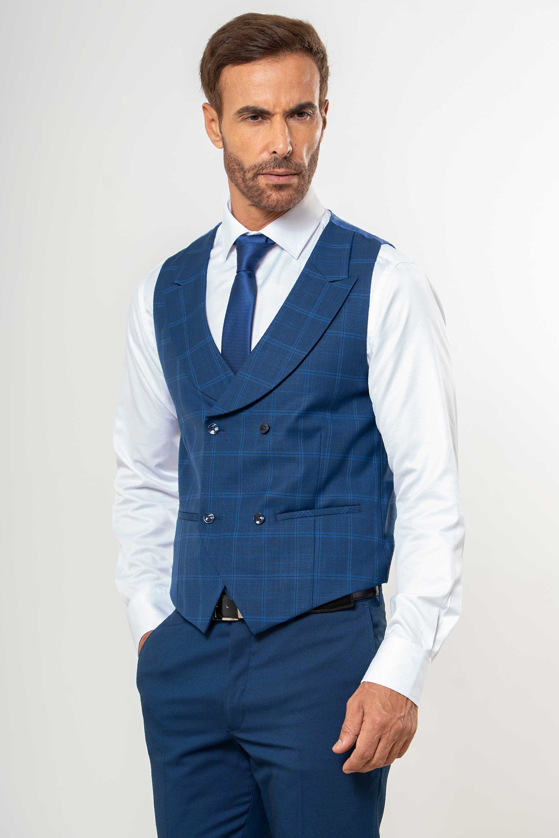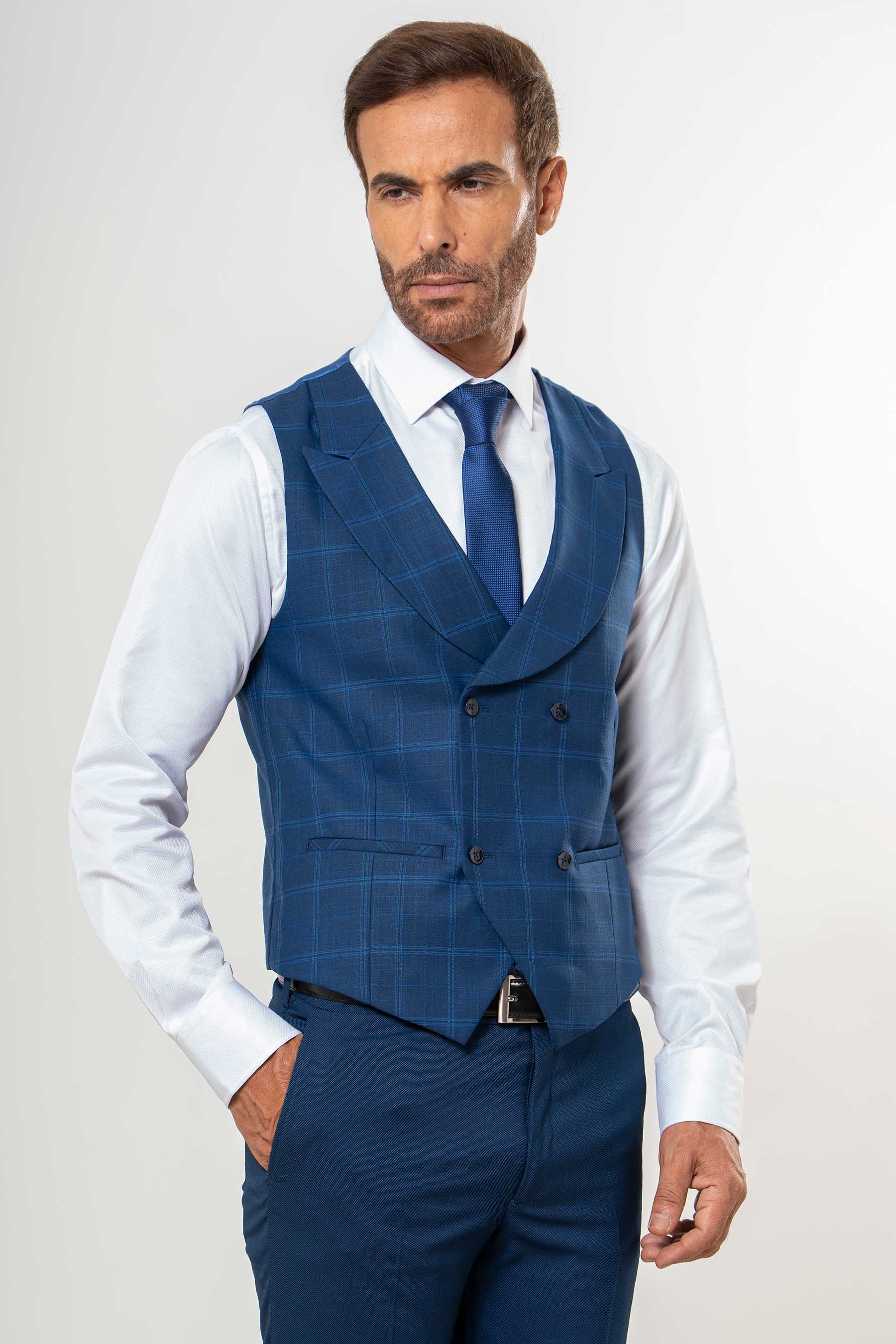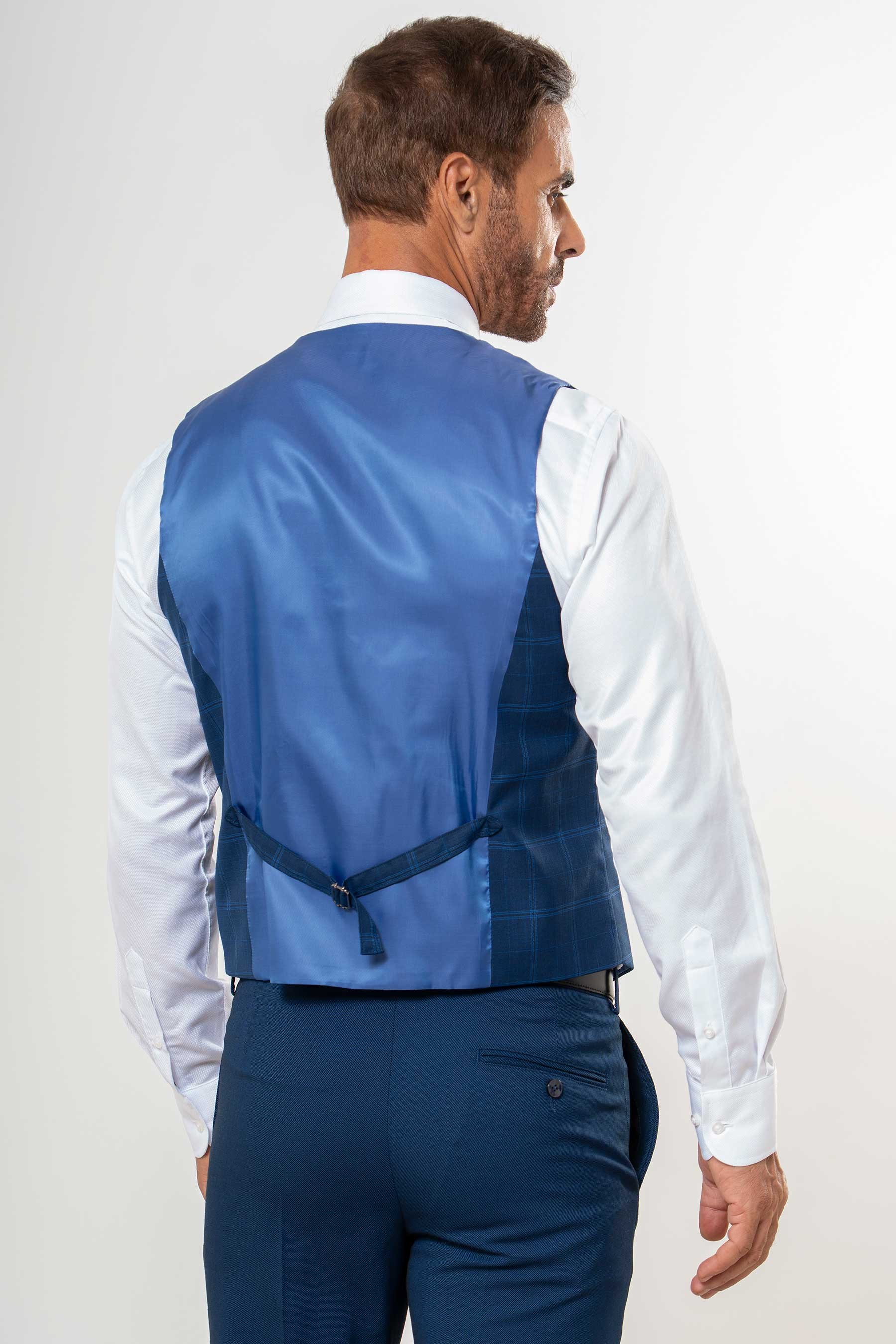 Chaleco cruzado con solapa cuadrícula grande azul, dos bolsillos delanteros, abotonadura cruzada de dos botones y uno interior. Trabilla trasera ajustable con aplique metálico. Espalda lisa al tono.