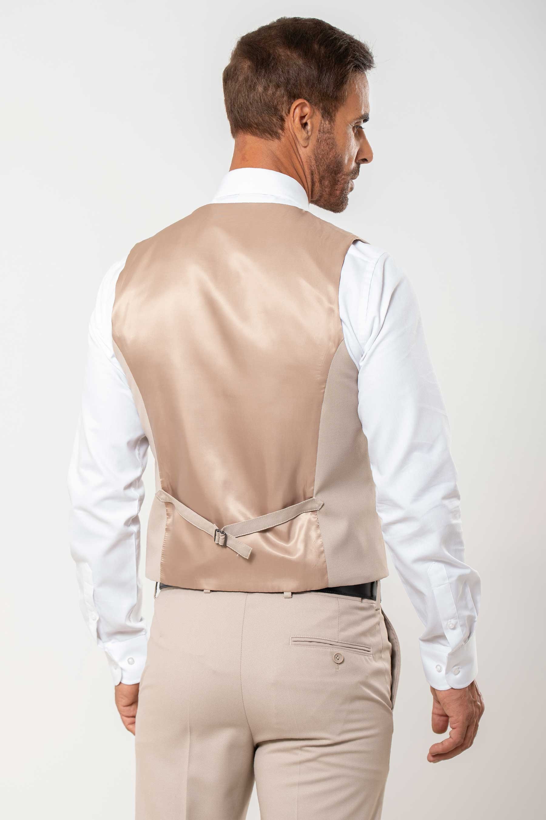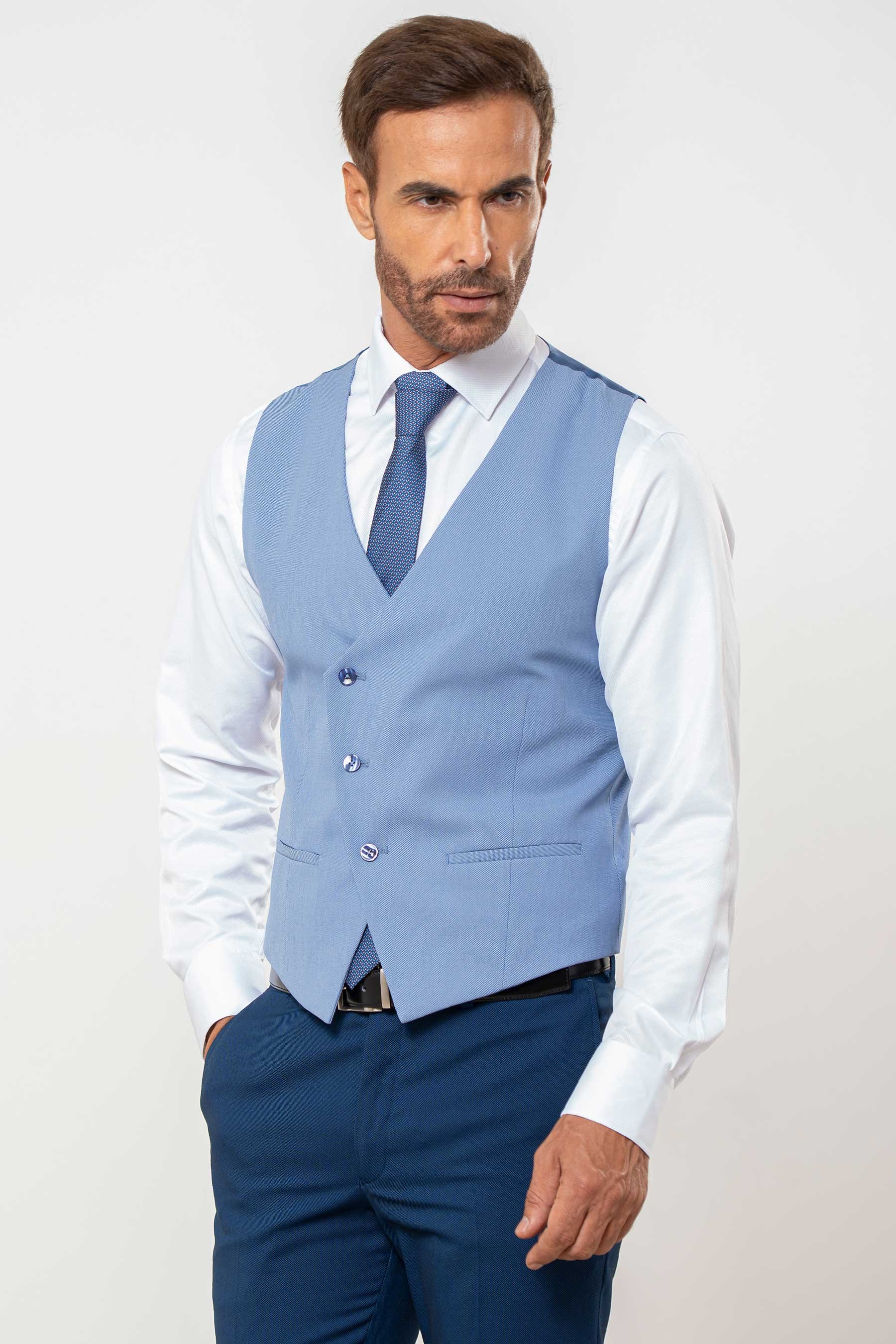Chaleco cruzado minipuntillé, dos bolsillos delanteros, abotonadura cruzada de tres botones y uno interior. Trabilla trasera ajustable con aplique metálico. Espalda lisa al tono.