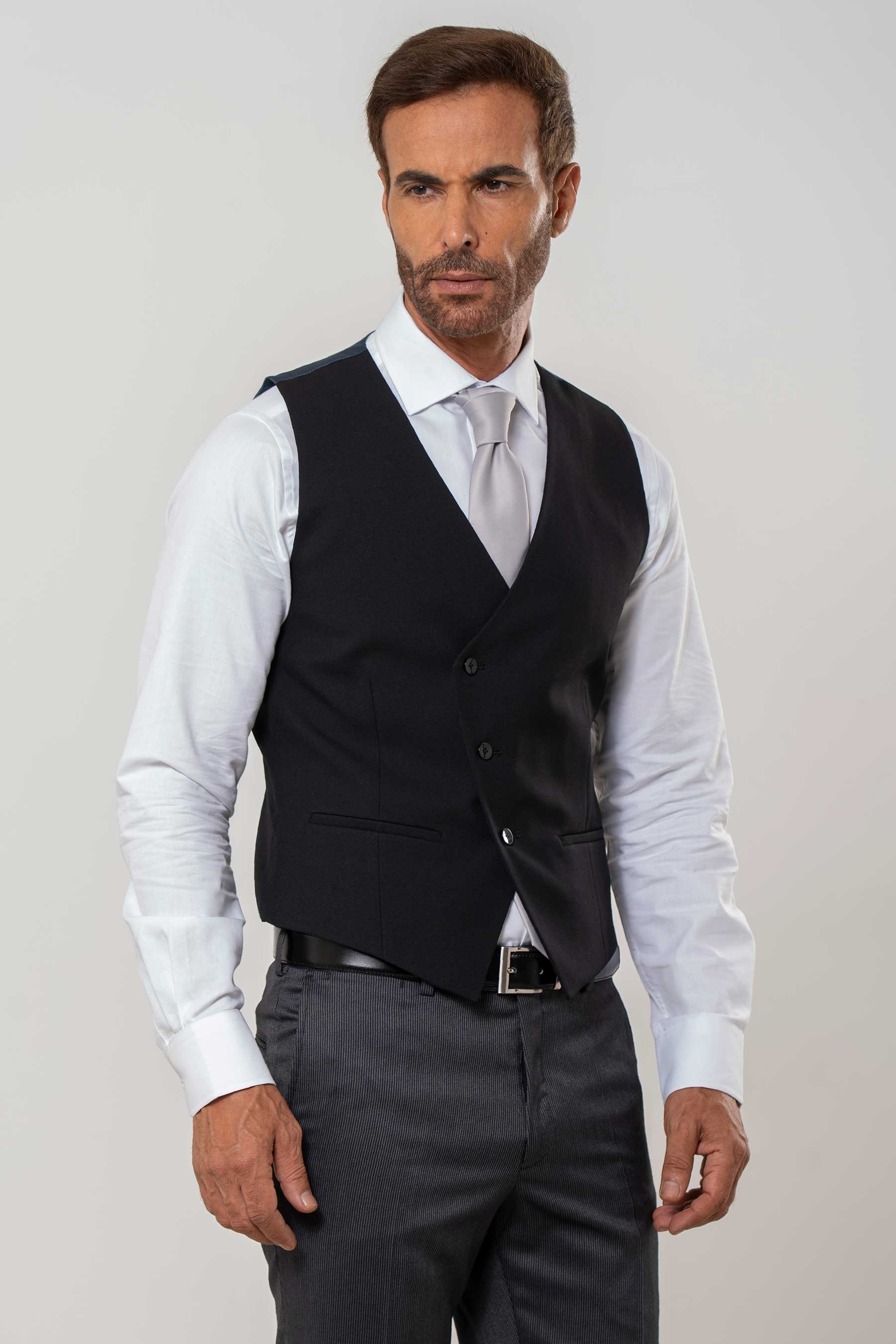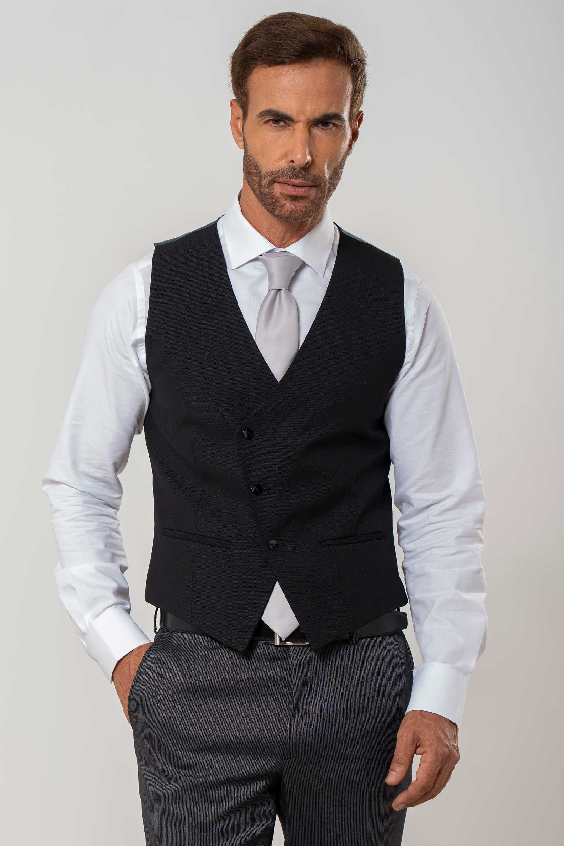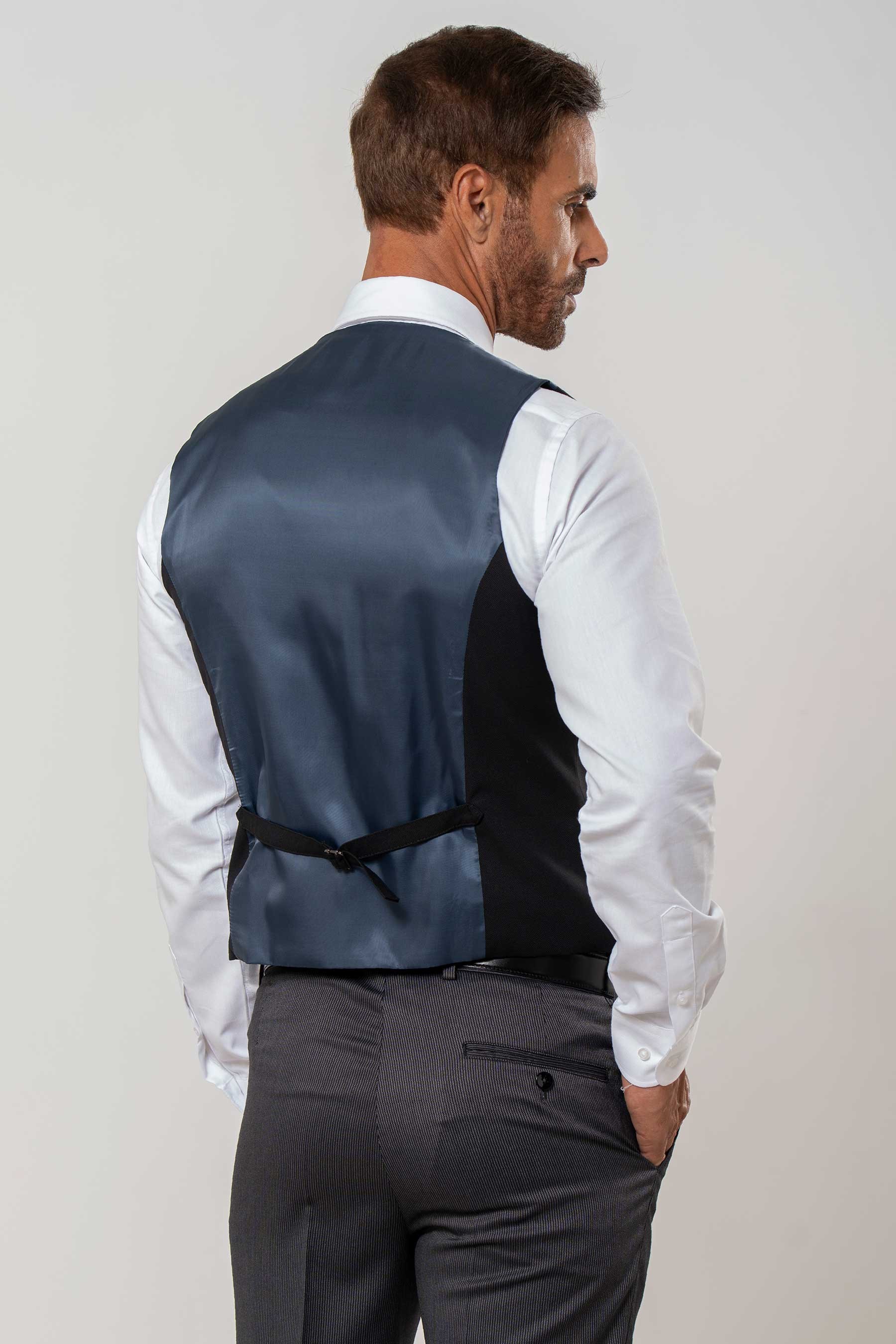 Chaleco cruzado minipuntillé, dos bolsillos delanteros, abotonadura cruzada de tres botones y uno interior. Trabilla trasera ajustable con aplique metálico. Espalda lisa al tono.