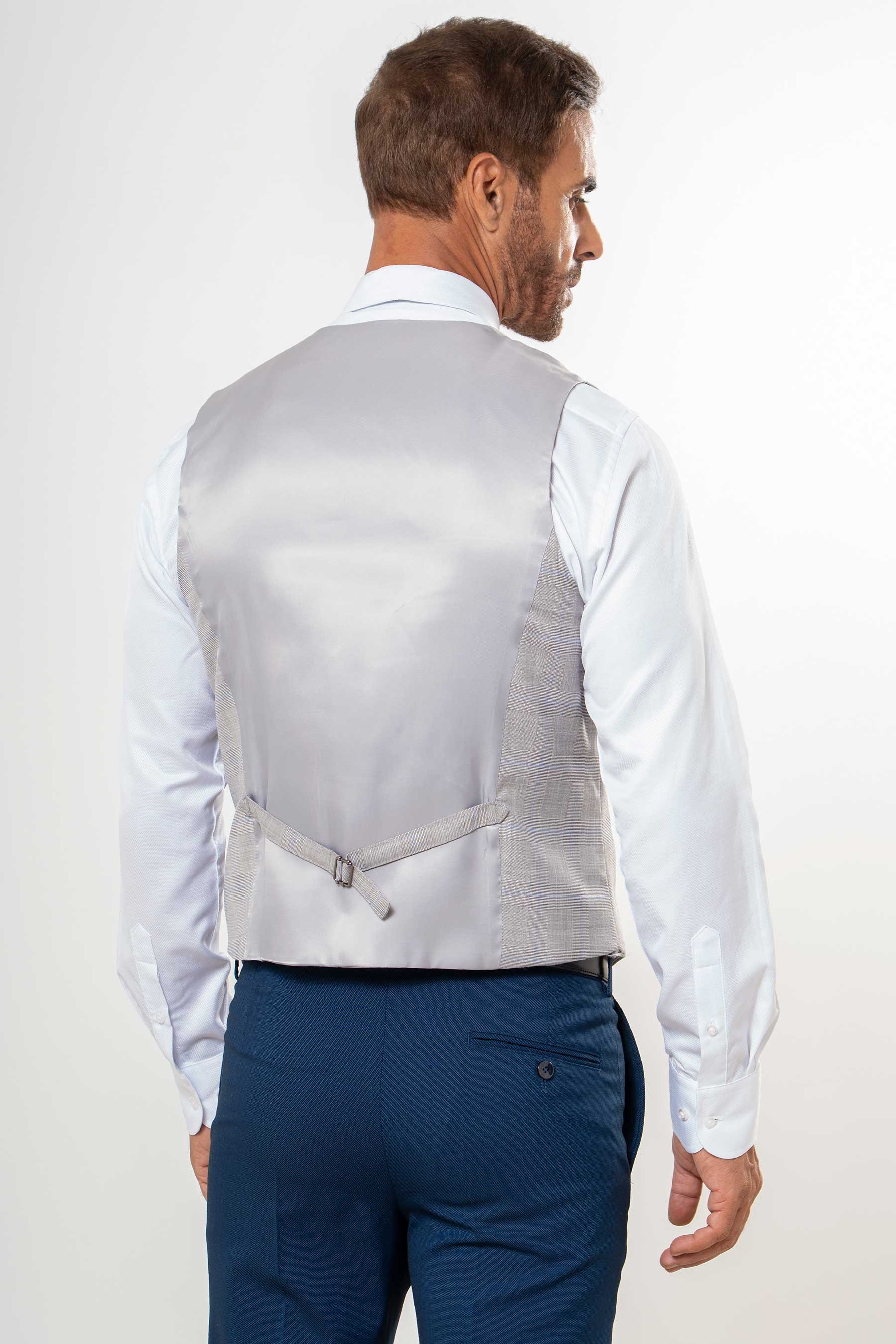 Chaleco cruzado cuadro discreto gris, dos bolsillos delanteros, abotonadura cruzada de tres botones y uno interior. Trabilla trasera ajustable con aplique metálico. Espalda lisa.
