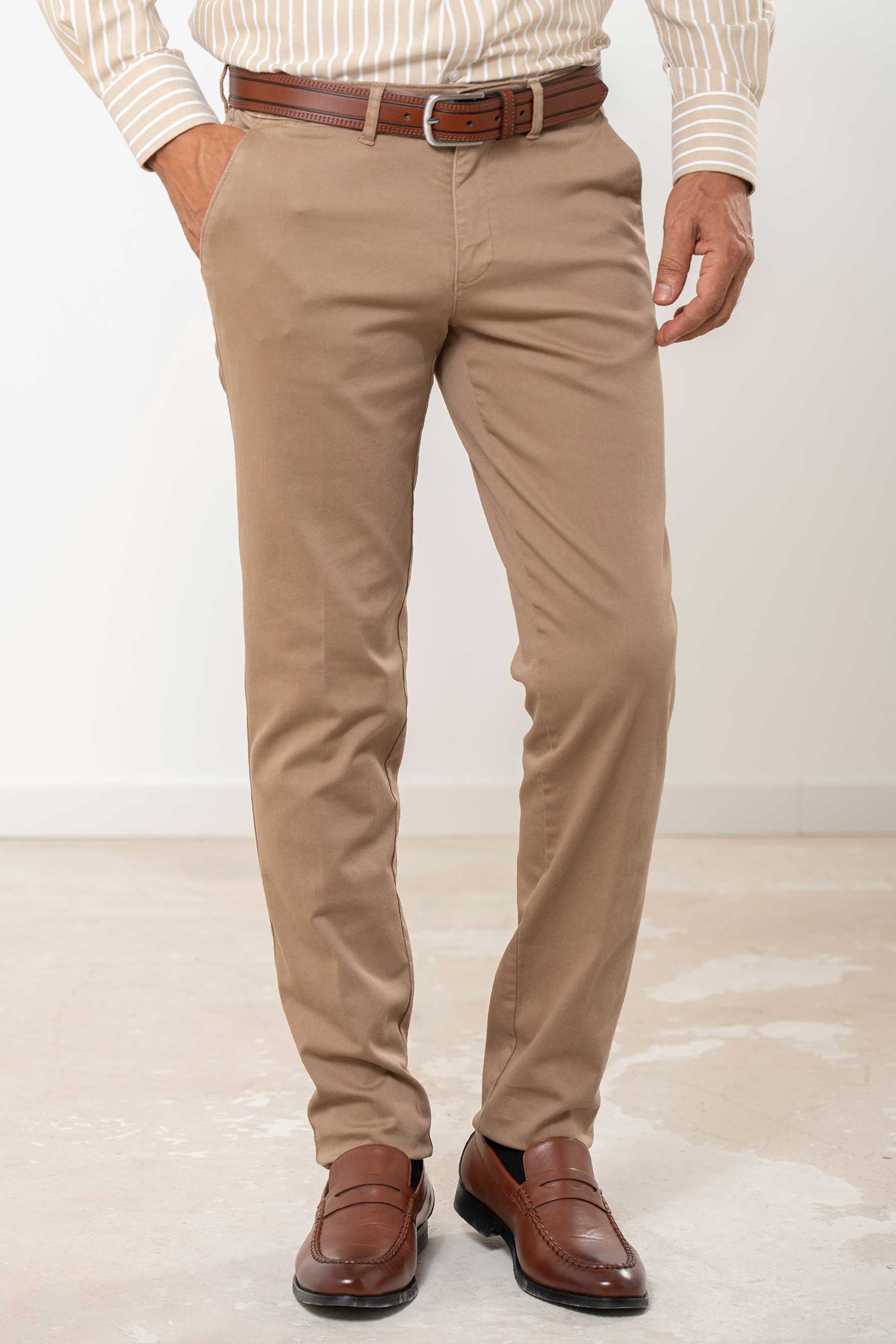 Pantalón chino elástico en algodón perchado, de corte regular fit, dos bolsillos inclinados y dos bolsillos traseros con botón. Cierre delantero de cremallera y botón superior. Interior combinado con tejido estampado.