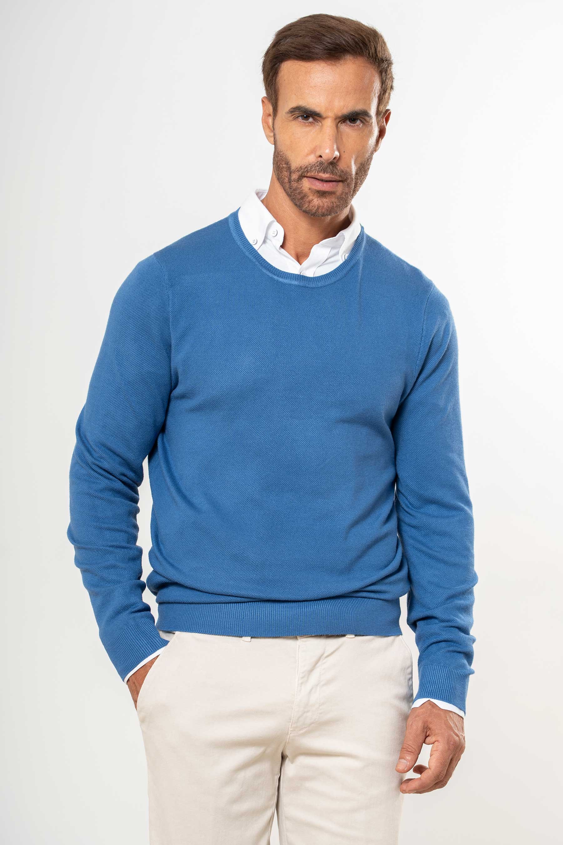 Jersey liso estructura. Cuello redondo y puños acanalados.