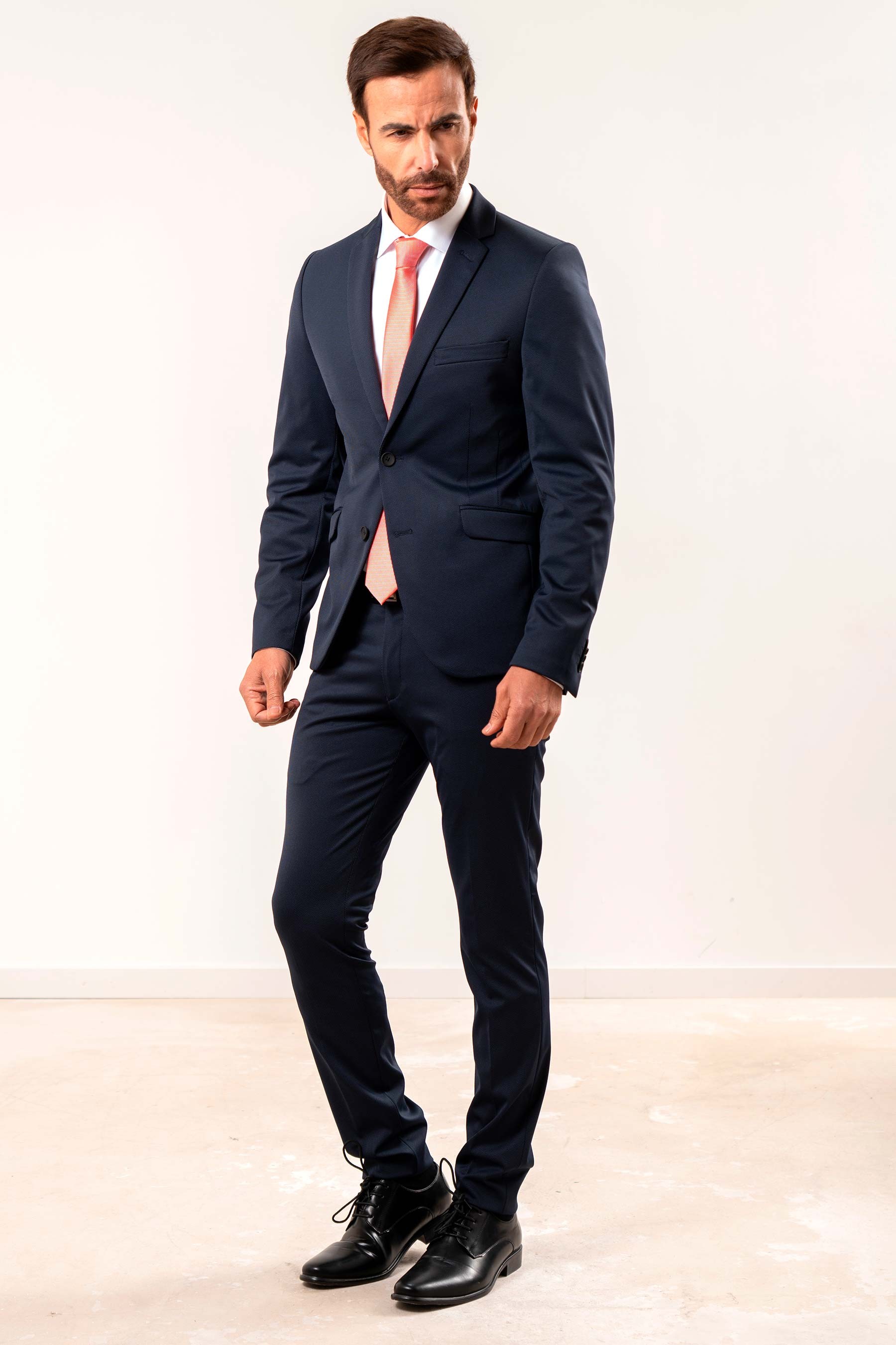 Traje súper elástico micropunto máximo confort, patrón Extra Slim, con carteras inclinadas. Una abertura trasera y cierre con dos botones. Interior con tres bolsillos y forro liso azul contrastado con vivos. Pantalón Extra Slim sin pinzas y cinturilla interior extensible. Botones de repuesto incluidos.