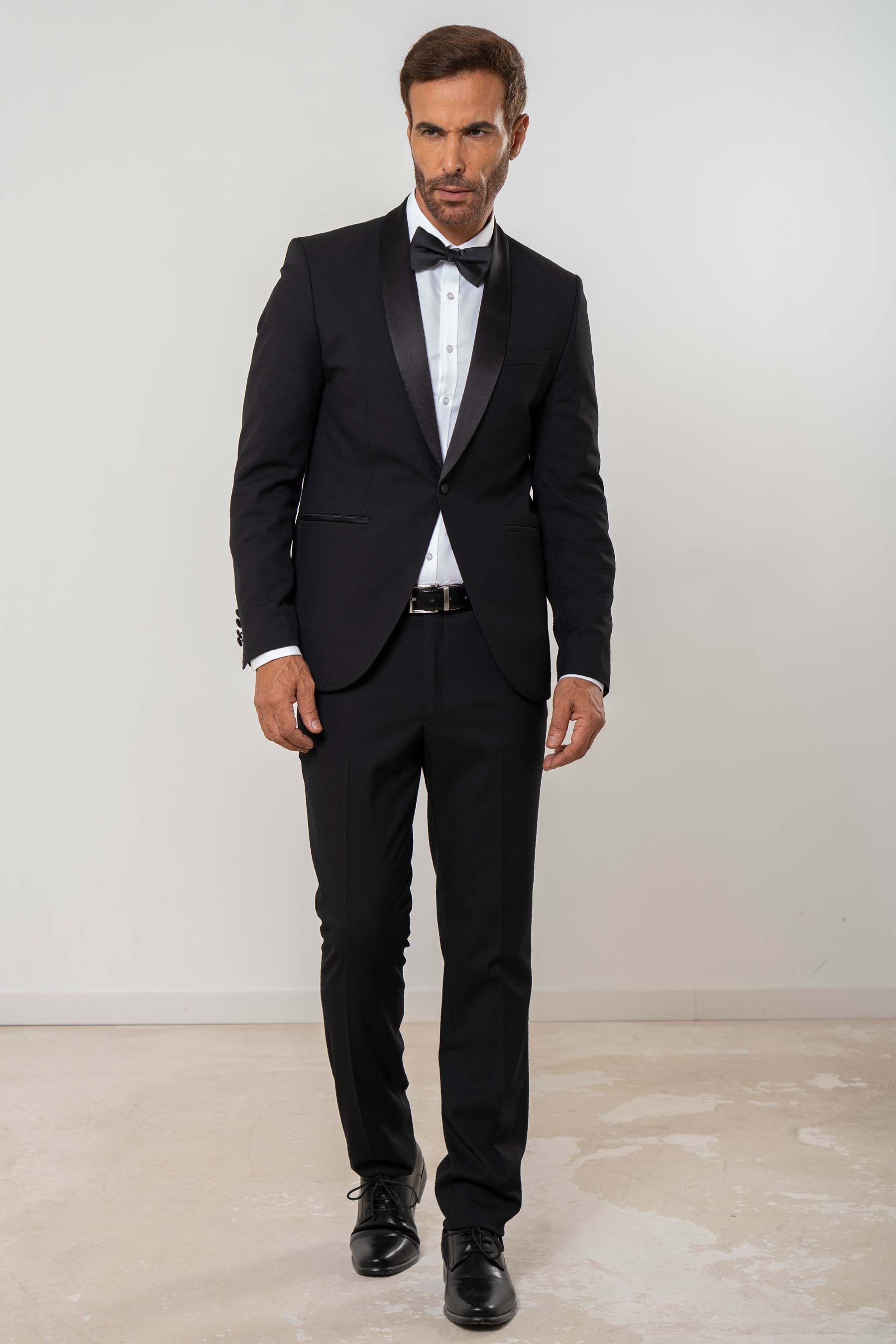 Esmoquin elástico microestructura, patrón Slim Fit. Americana con solapa de raso satén, cierre con un botón y una abertura trasera. Botones de chaqueta forrados y bolsillos con vivo raso satén. Interior con tres bolsillos y forro liso negro contrastado con vivos en granate. Pantalón Slim Fit sin pinzas y cintura extensible. Botones de repuesto incluidos.